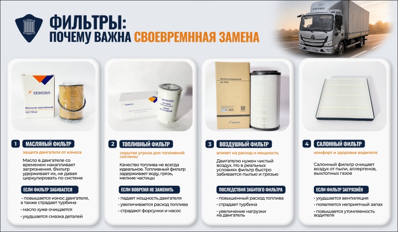 Регулярная замена фильтров — это самый простой и доступный способ продлить срок службы грузового автомобиля и избежать лишних затрат.